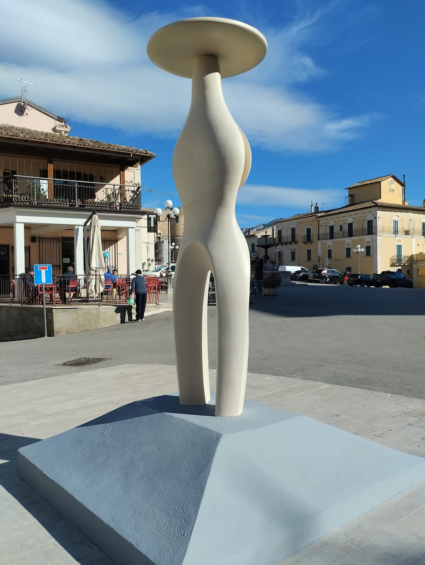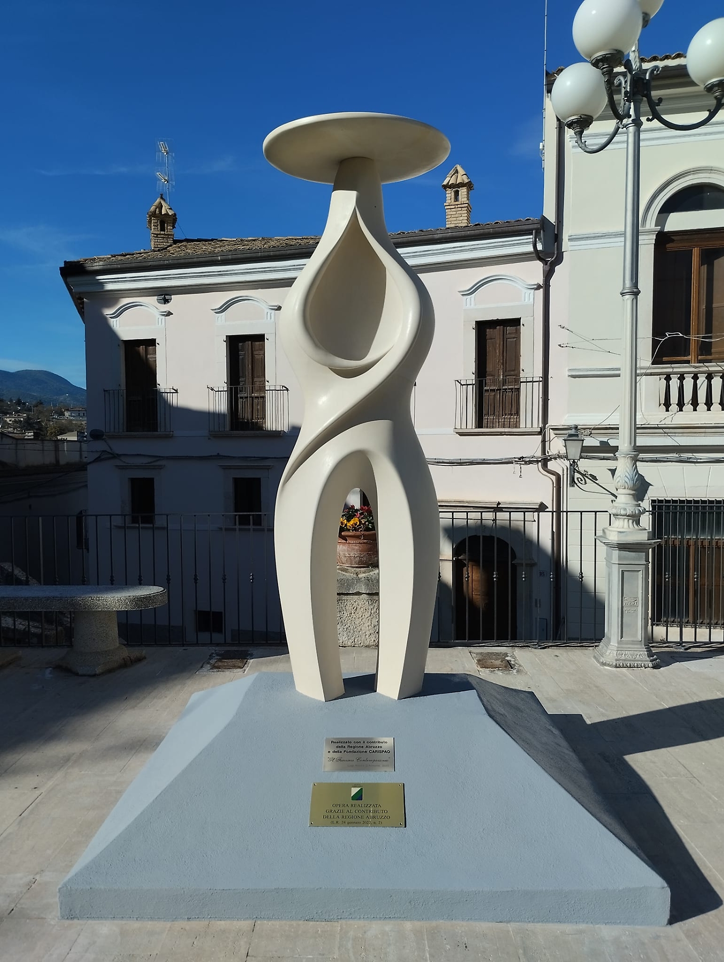 La statua, ispirata al celebre guerriero italico del VI secolo a.C., rinvenuto nella necropoli dell'antica città di Aufinum e oggi esposta al Museo Archeologico di Chieti, è stata realizzata in elegante pietra paglierina della Maiella. Luigi D'Alimonte, scultore di Cugnoli, ha creato un'opera alta oltre due metri che, pur riconoscibile come il reperto archeologico, si spinge verso nuove linee ed espressioni artistiche. L'apertura visibile nella parte alta della scultura ricorda un cuore capovolto, simbolo dell'amore per il territorio, mentre il braccio sinistro, raffigurato come un continuum con la spada, rappresenta una rilettura moderna del guerriero.